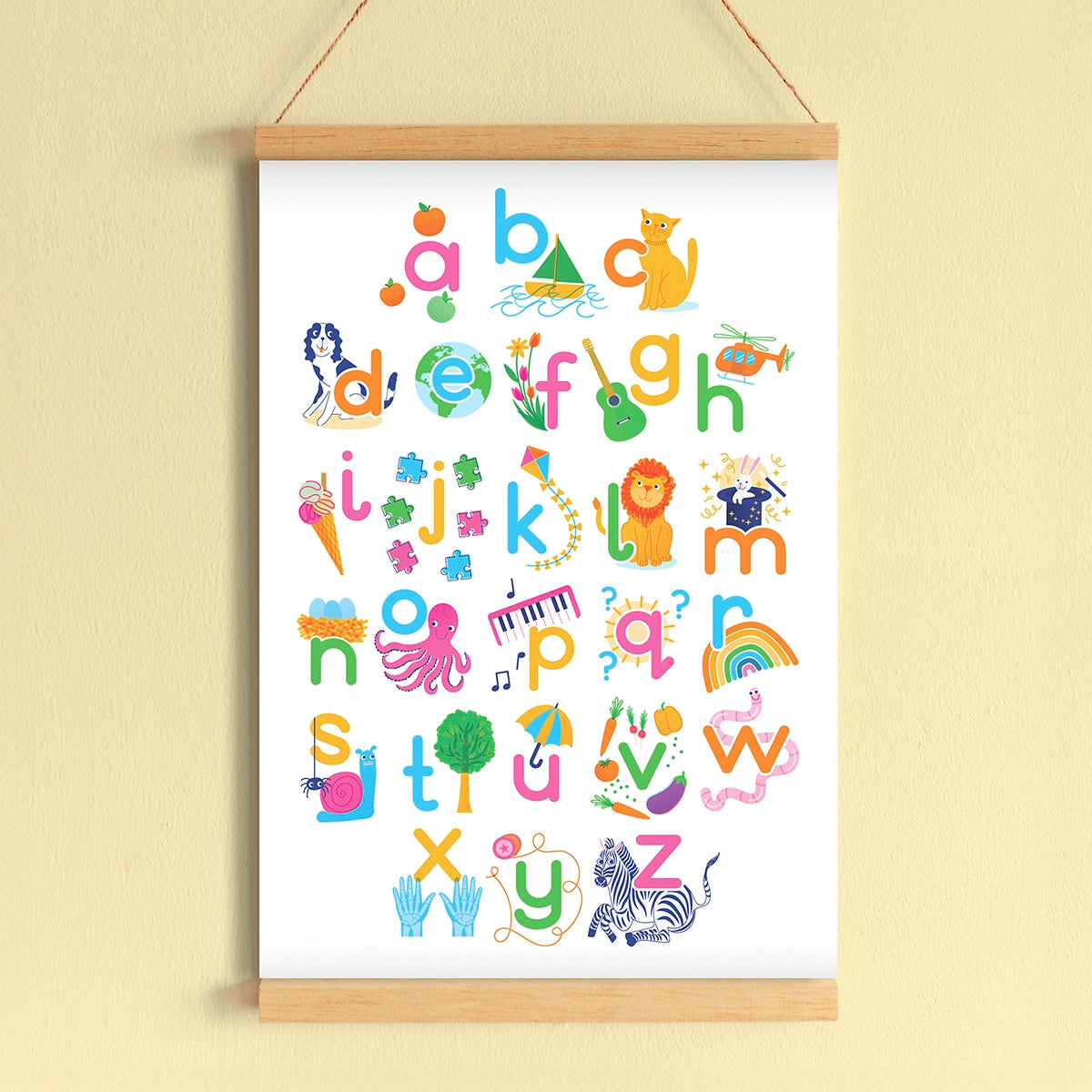 This colourful alphabet print features 26 unique A-Z illustrations created by me in my Yorkshire studio. Add a splash of colour to your little one’s bedroom gallery wall or as a standalone piece. All prints are created to order by me in my North Yorkshire studio. Designs are carefully created and printed onto natural white, uncoated 300gsm card that has a slight texture.