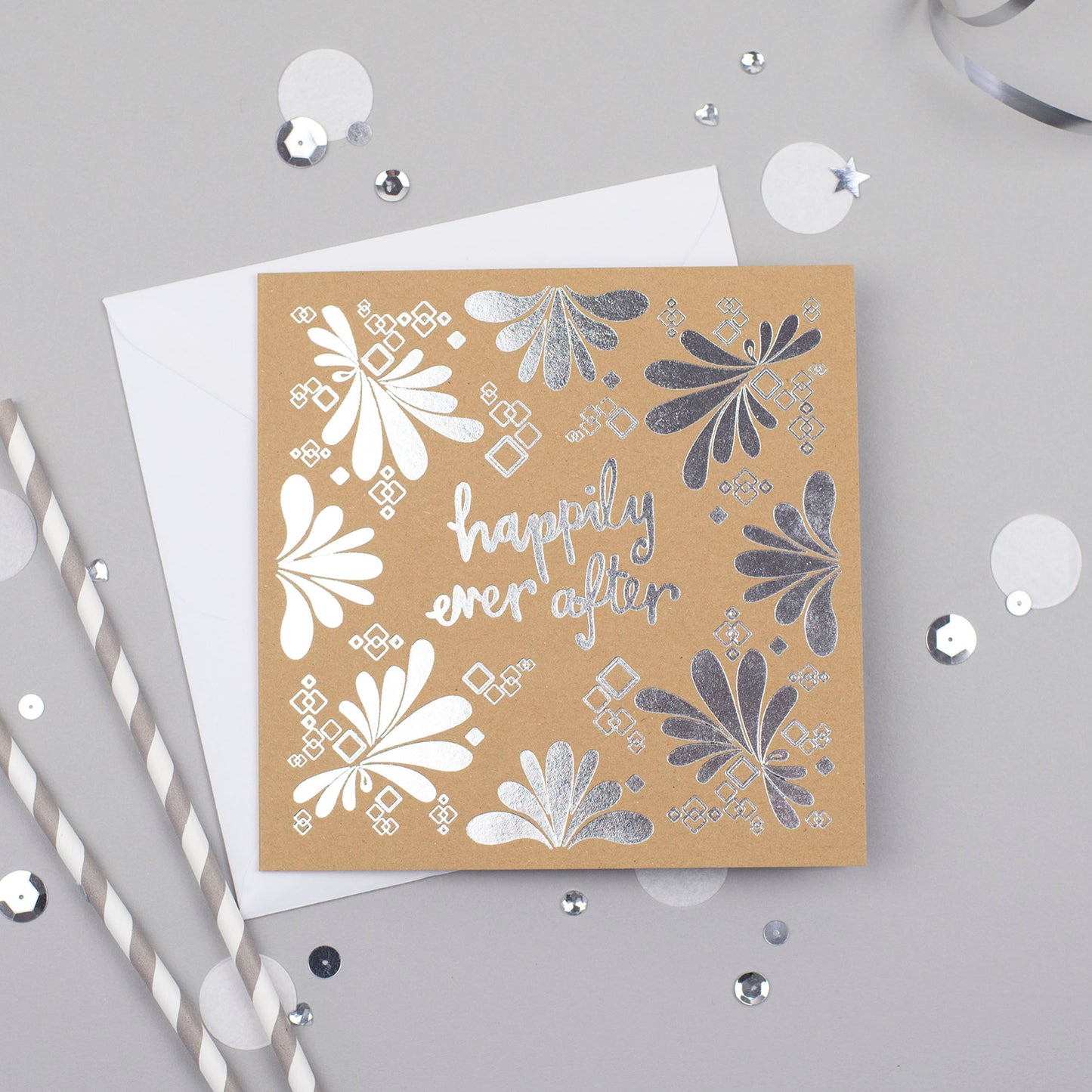 Send your best wishes to a happy couple with the silver foil 'Happily Ever After' card.