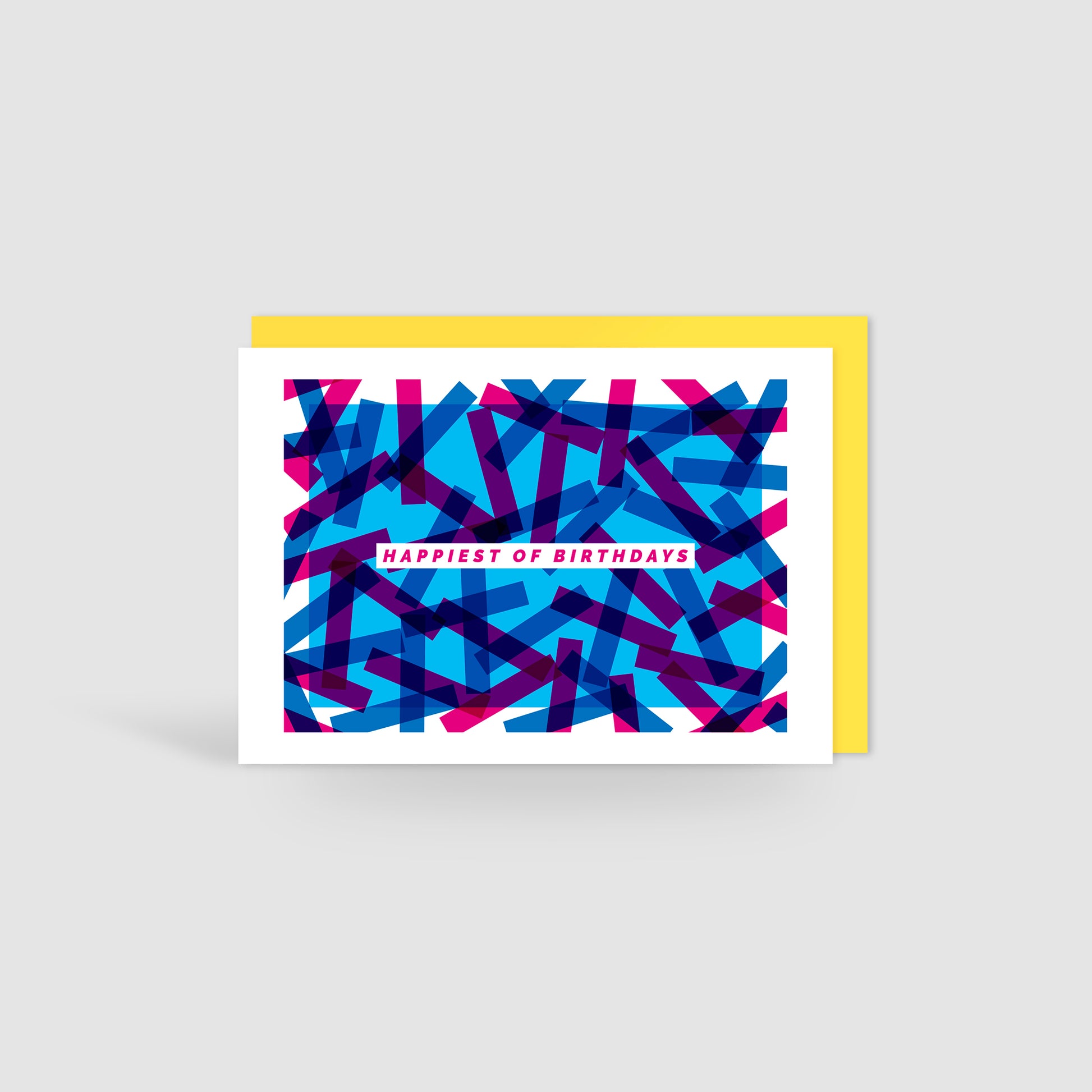The 'Happiest of Birthdays' design features a colourful geometric pattern.