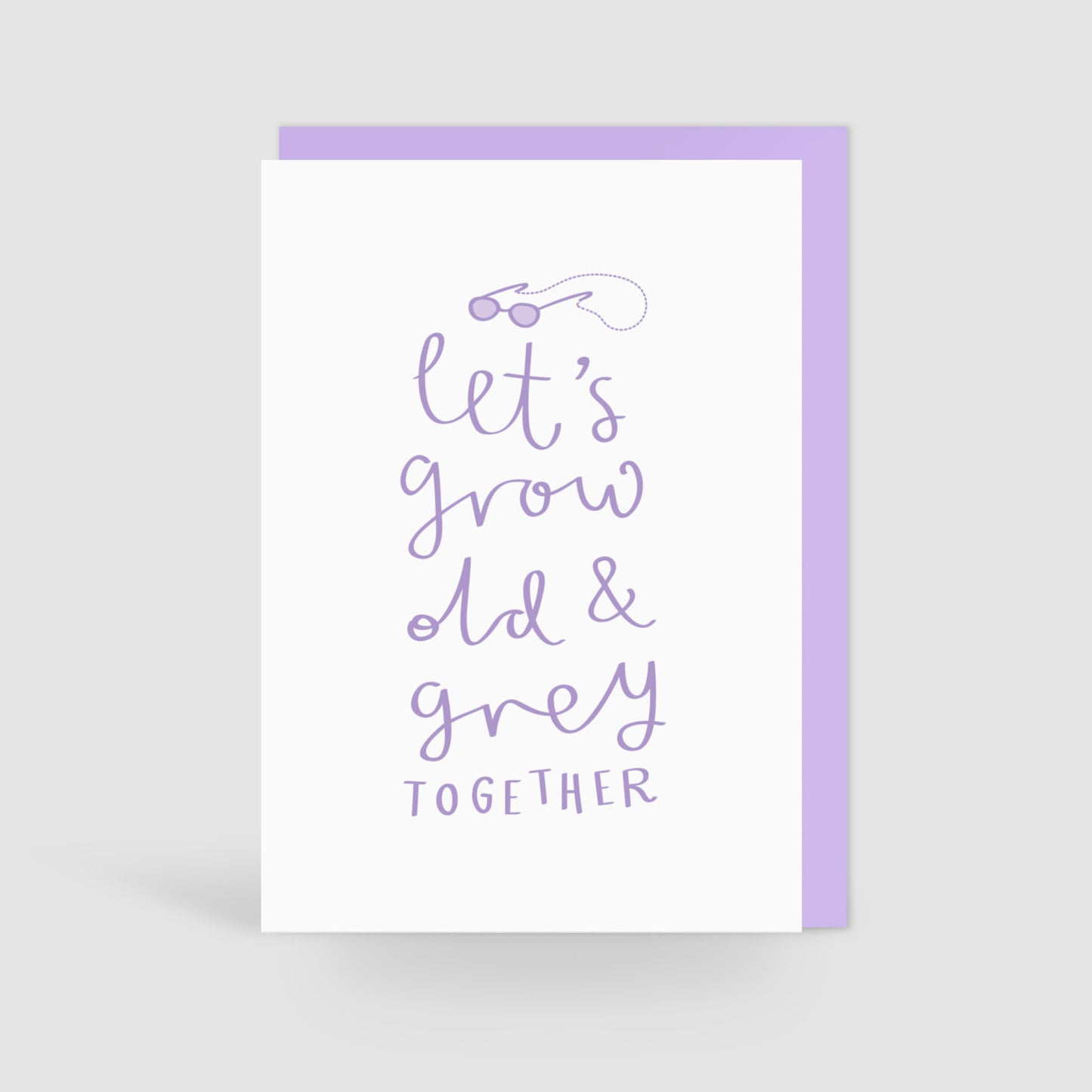 The 'Let's Grow Old & Grey Together' design features an understated combination of simple illustration with hand drawn typography.