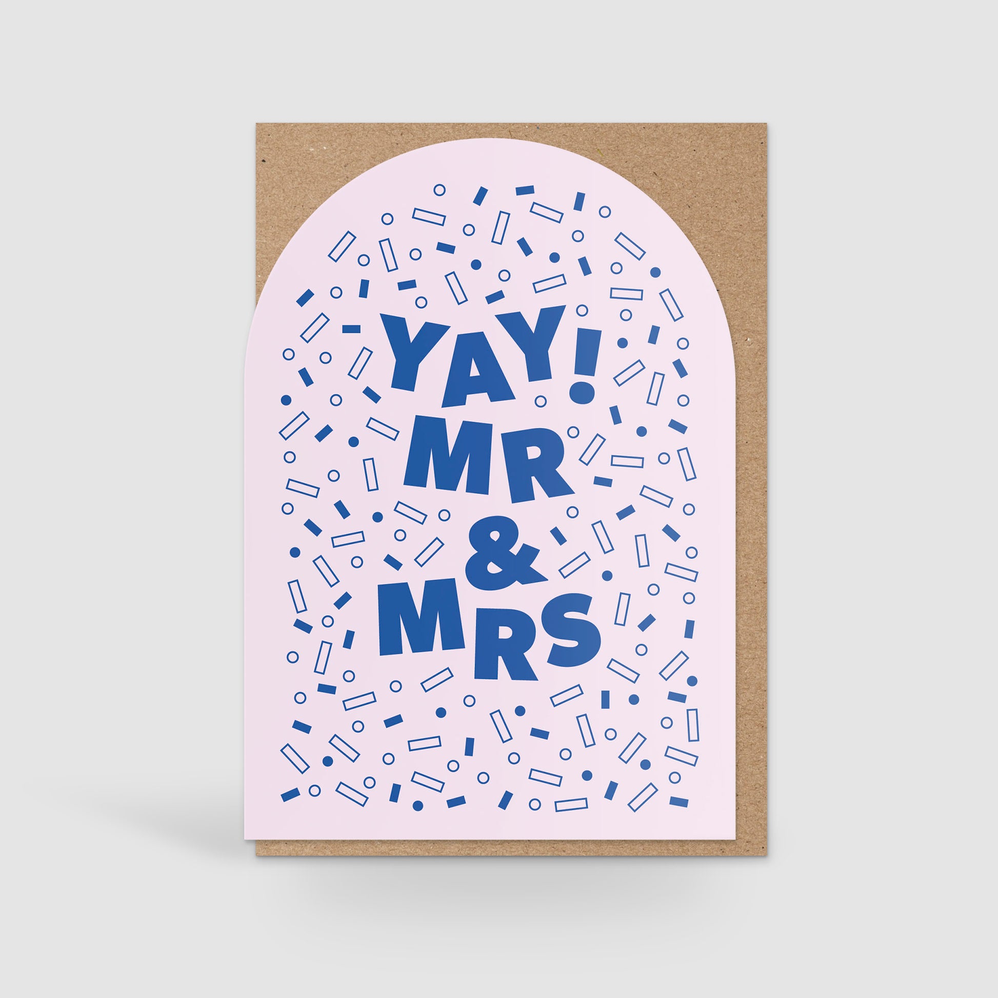 Send your best wishes to a couple who are tying the knot with this modern 'Yay Mr & Mrs' card. Featuring an abstract confetti style design in a pale pink and dark blue colour palette. The design is printed onto an ivory, arch shaped card which has a slight texture. A similar design is available for Mrs & Mrs and Mr & Mr.