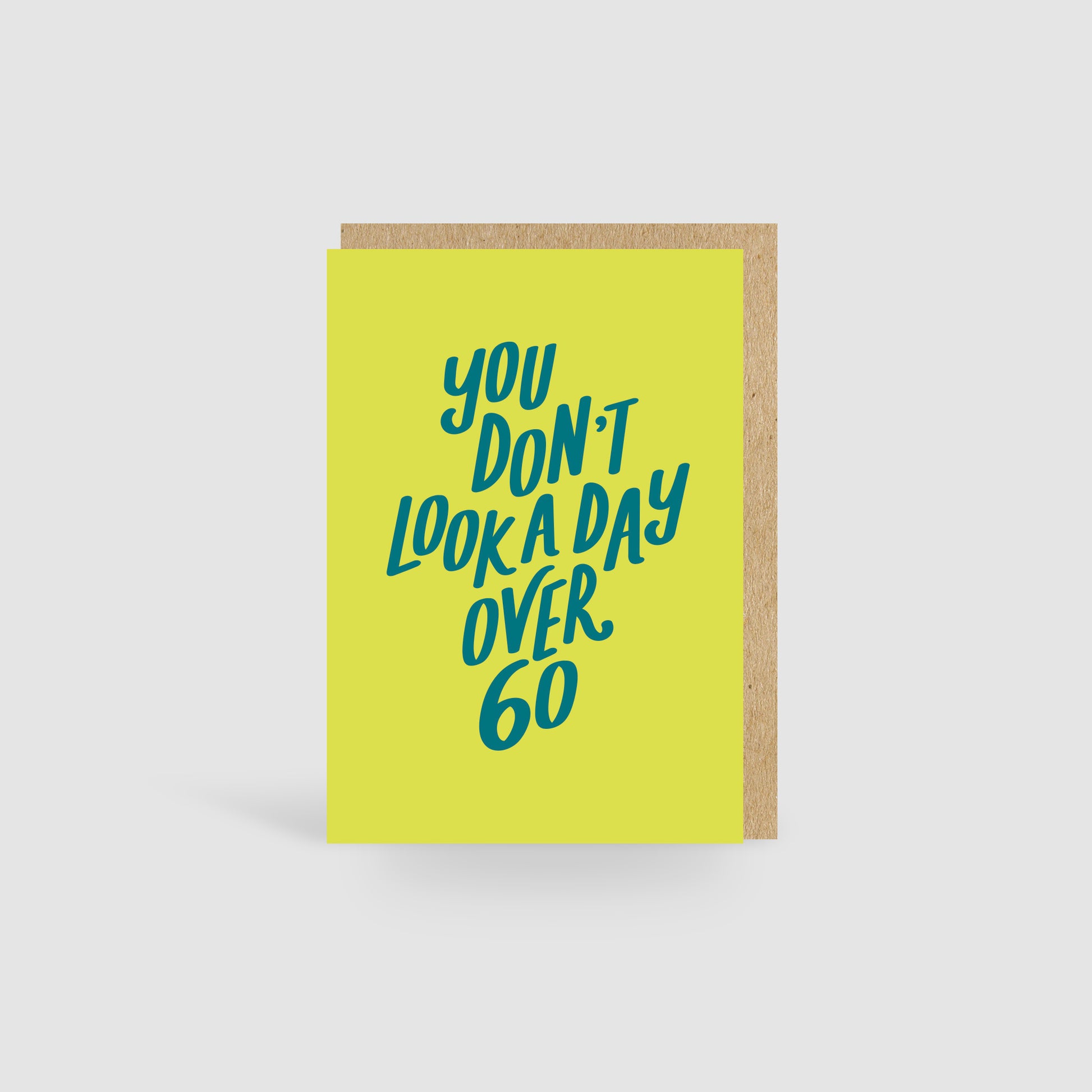 The colourful 'You Don't Look A Day Over 60' design features simple hand-drawn typography and a bright colour palette.